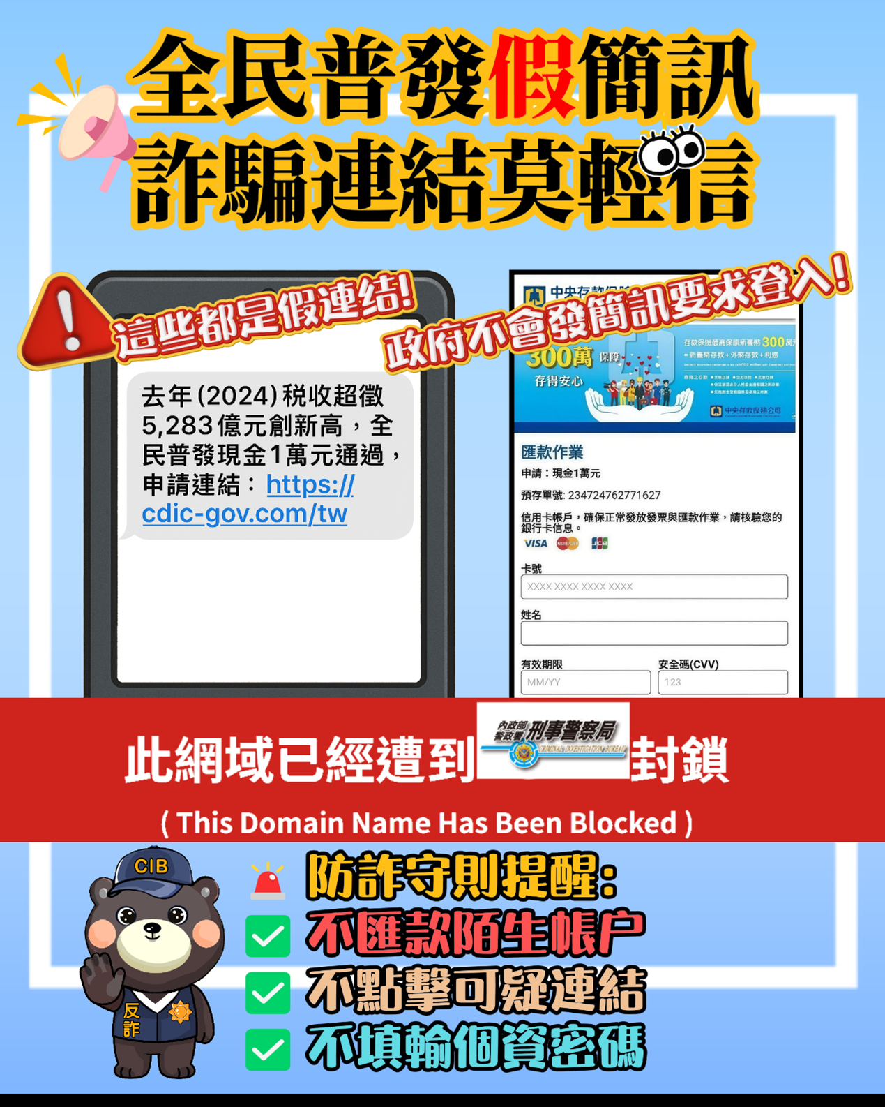 警政署刑事警察局近期發現詐騙集團以普發現金一萬元為題,發送釣魚簡訊予民眾,誘騙民眾點擊連結至假冒中央存保公司網站輸入信用卡號、銀行帳戶及個人資料等敏感資訊以進行金融詐騙,危害民眾財產安全,為防制詐騙威脅擴大,特製作宣導素材加強推播宣導。